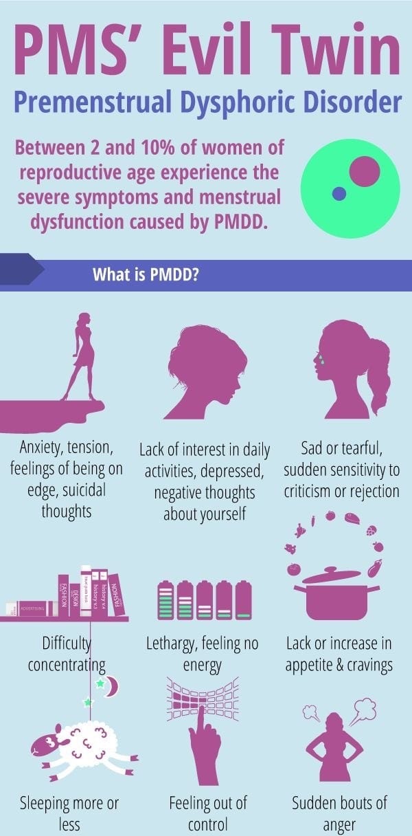 Pmdd - Guide to Treating PMDD (Premenstrual Dysphoric Disorder ... / Pmdd is a severe form of premenstrual syndrome (pms).. Pmdd is considered a severe from of premenstrual syndrome, or pms, with symptoms such as depression and irritability that significantly interfere with women's lives, at home and at work, with. Pmdd is a severe form of premenstrual syndrome (pms). Pmdd symptoms happen during the second half of a woman's period. But pmdd also causes severe anxiety, depression and mood changes. However, for people who suffer from pmdd, their symptoms can make life impossible.